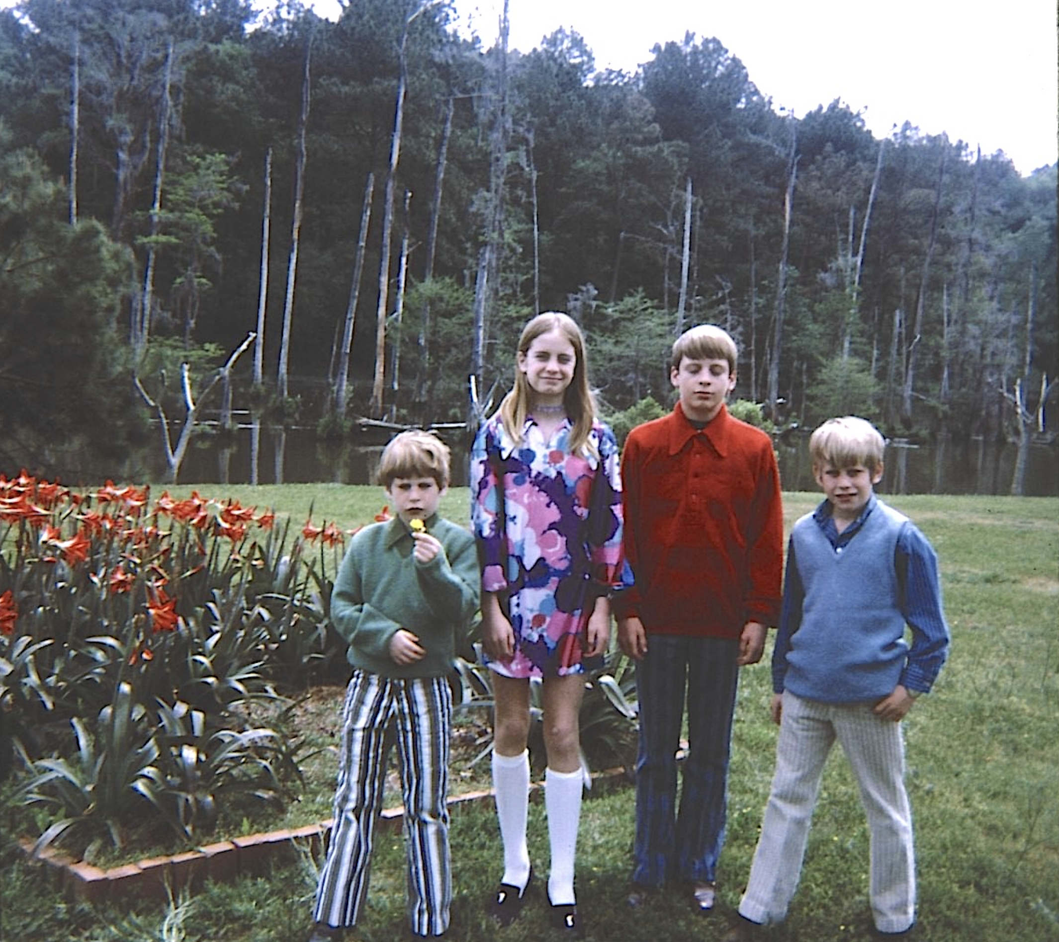 In the backyard of our Calgary home. My younger brother’s shading his eyes, I'm sporting a dapper black jacket and tie, my older brother’s thinking about quitting Sunday school, and my sister’s posing for a fashion magazine.