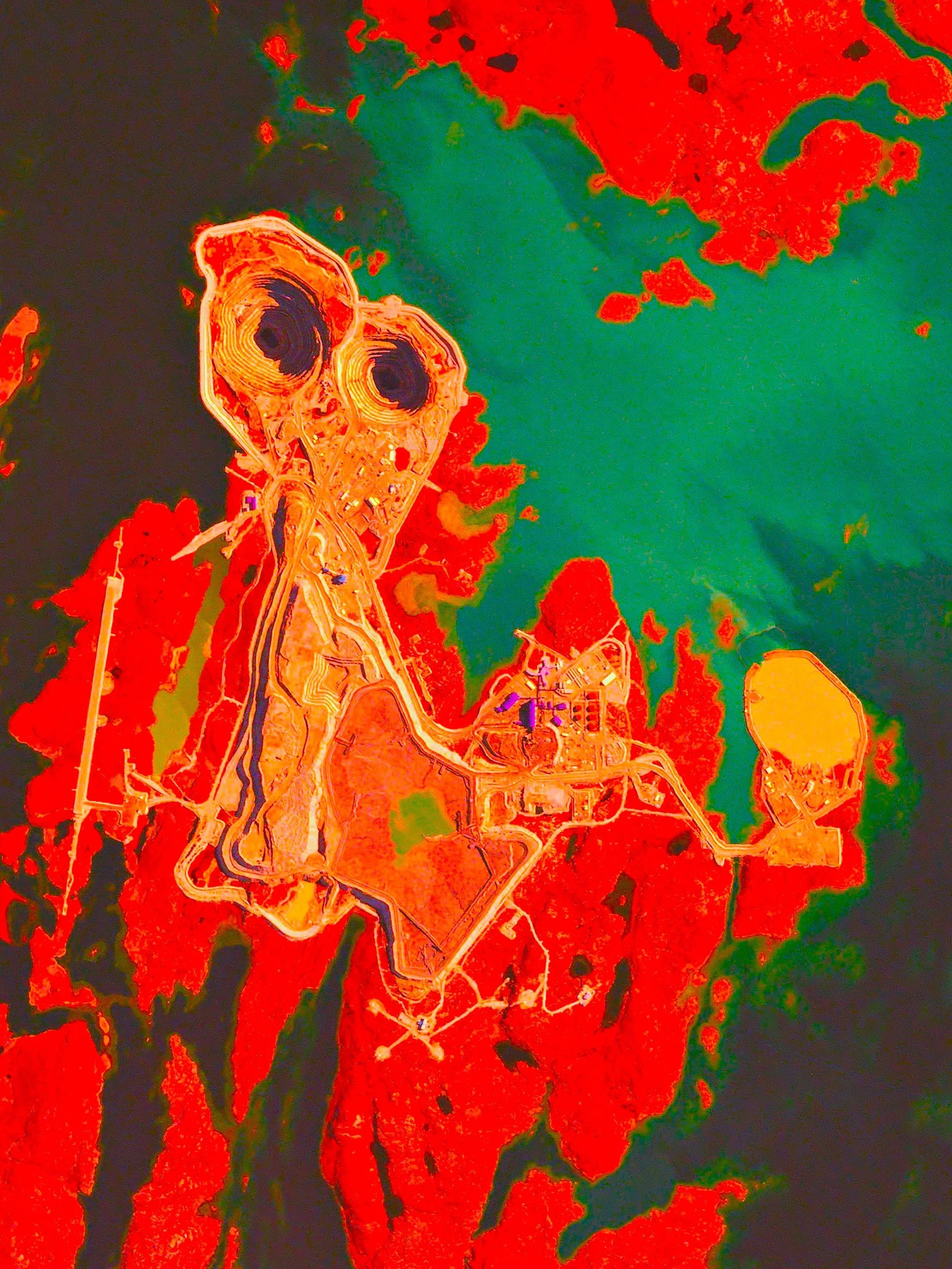 To Navamor, the mine looked like one of the Skystalker beasts of his home planetary system. These gigantic beasts were called The Elders and came from the Primal Ooze. Navamor put on his infracrimson glasses and looked more closely. It was as plain as day: its orange blood had already risen into its black hole eyes. The eyes had pierced from far beneath, up through the green sea that once was, and that was now being claimed by mining companies.