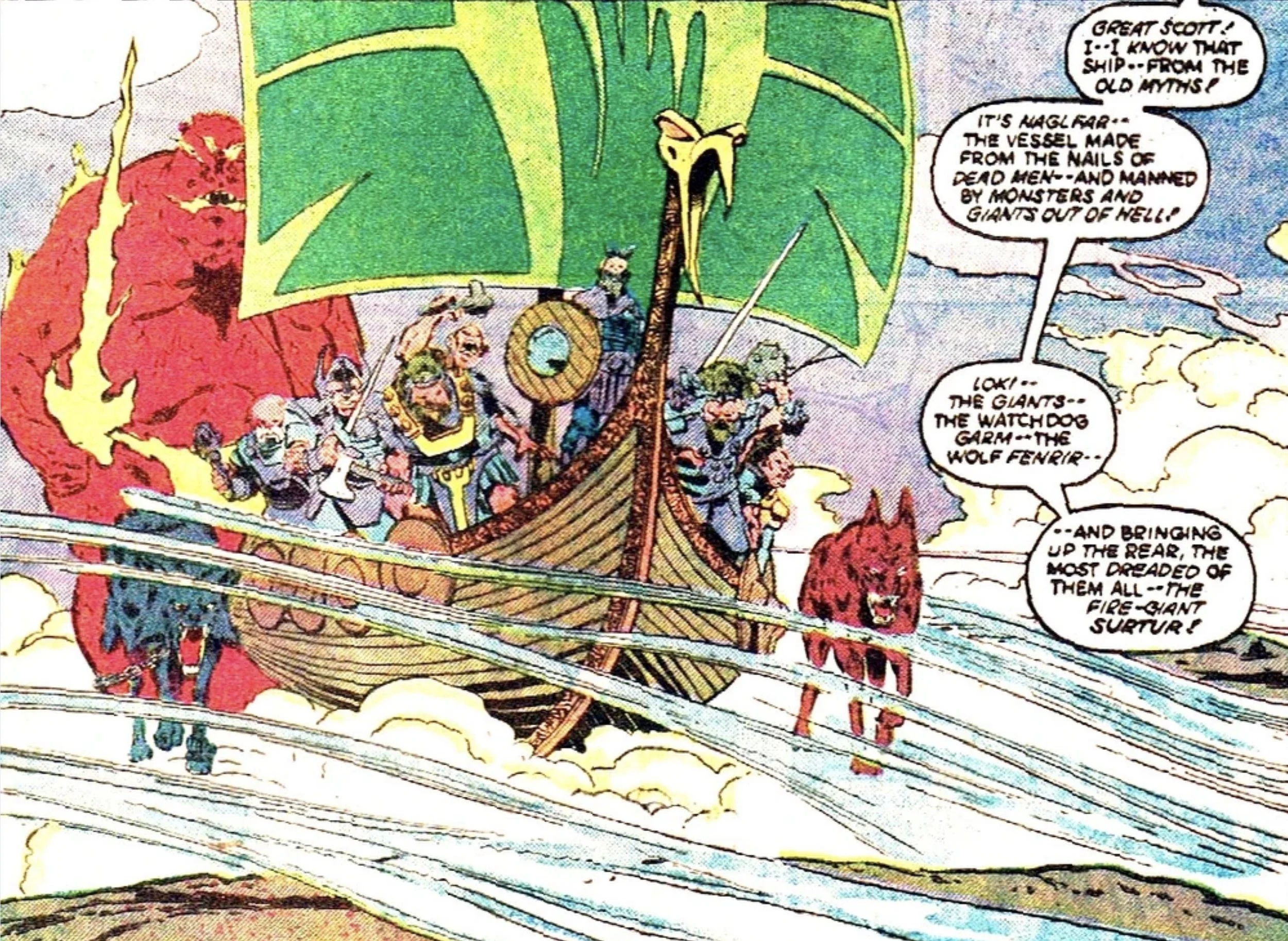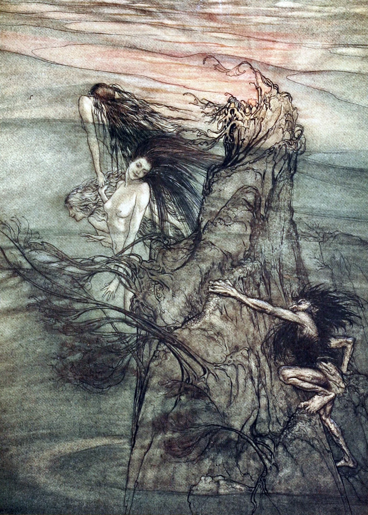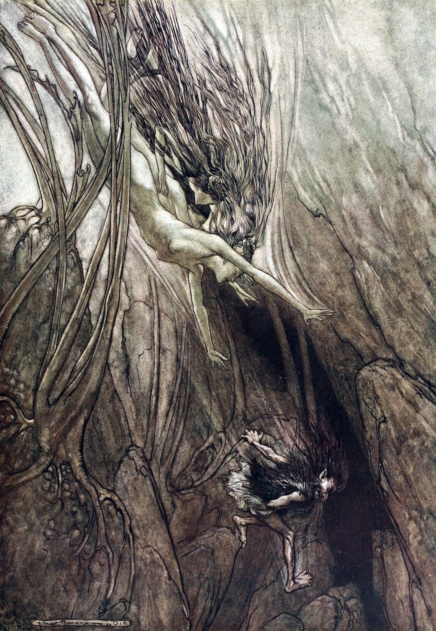 And who is this, slithering toward land from the watery depths? The ancient Snake? Or is it more specifically Jormungand, the wolf-serpent, looking very much like the lascivious Alberich?